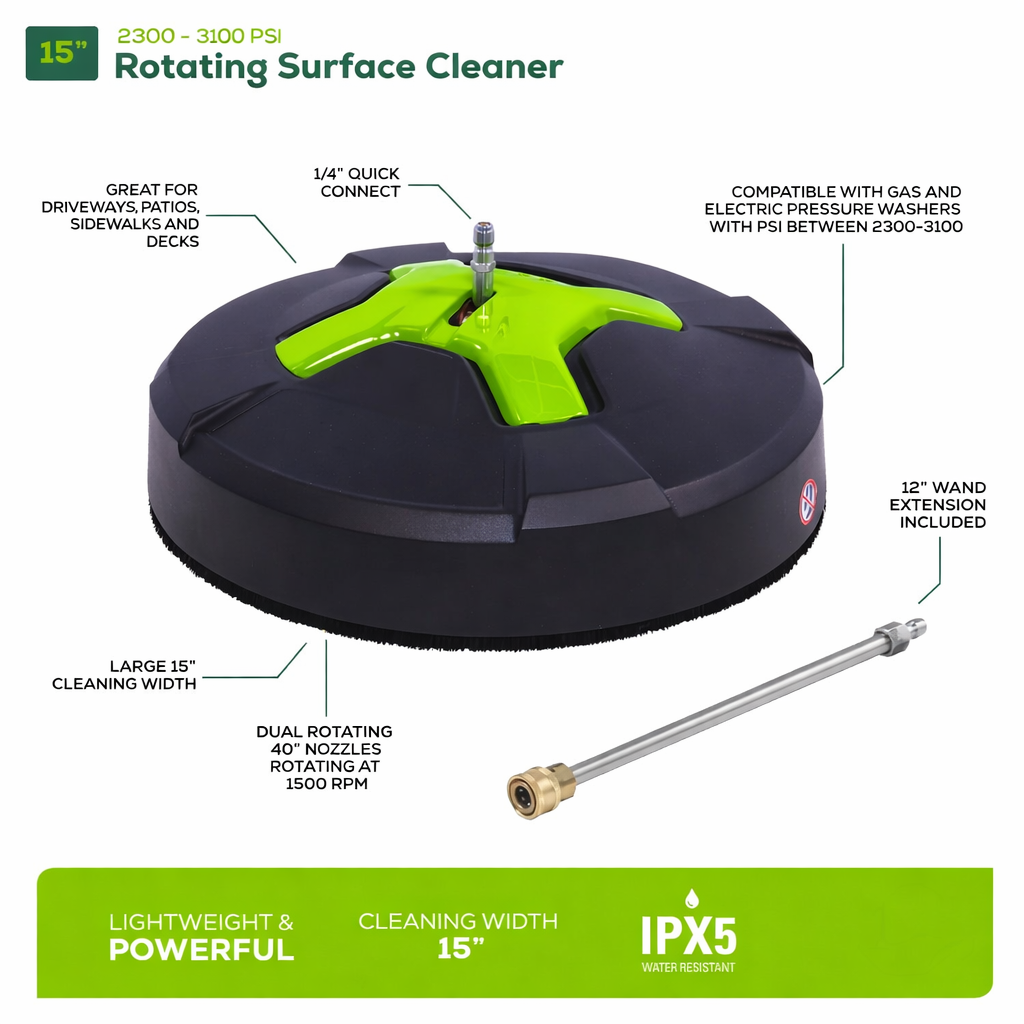 - 15″ surface cleaner attachment ensures even and streak-free cleaning for large flat areas