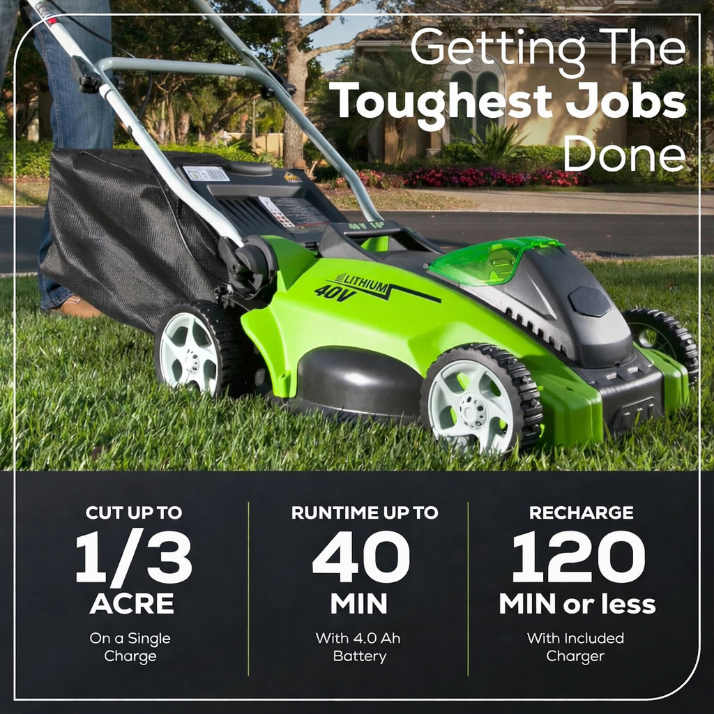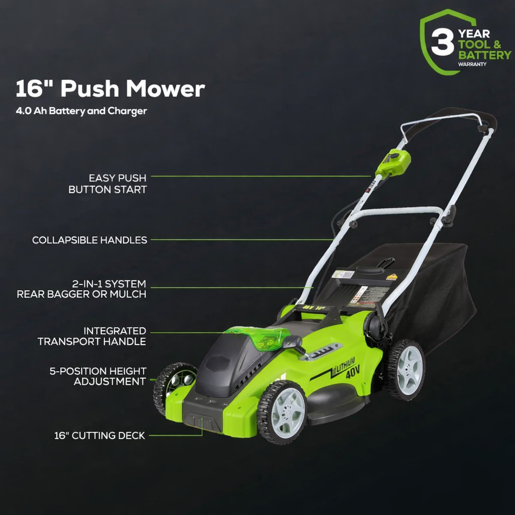 - (1) 40V 16″ Cordless Lawn Mower