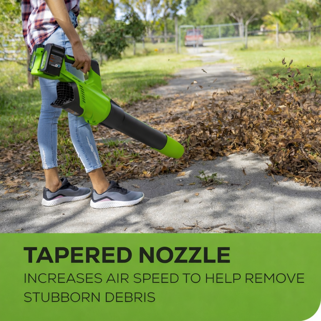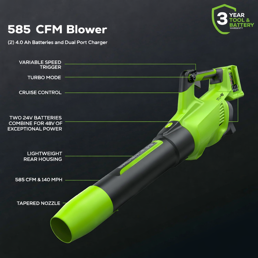 Powered by two 24V batteries combined into 48V, this blower produces 585 CFM airflow and 140 MPH airspeed, making it perfect for clearing leaves, debris, and even wet surfaces with ease.