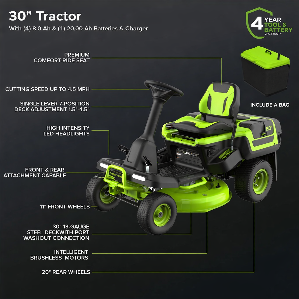 60V 30″ CrossoverT Riding Lawn Tractor with Bagger Included, (4) 8.0Ah + (1) 20.0Ah Batteries & 600W Charger