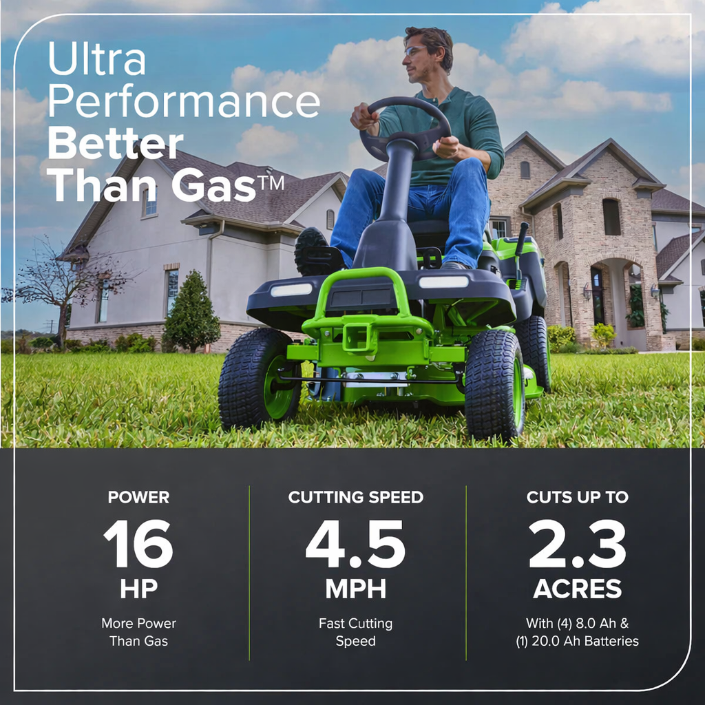 Take your lawn care to the next level with this powerful 60V riding lawn tractor, designed for efficiency, comfort, and zero hassle. Built with high-performance brushless motor technology, this mower delivers gas-equivalent power without the noise, maintenance, or emissions.