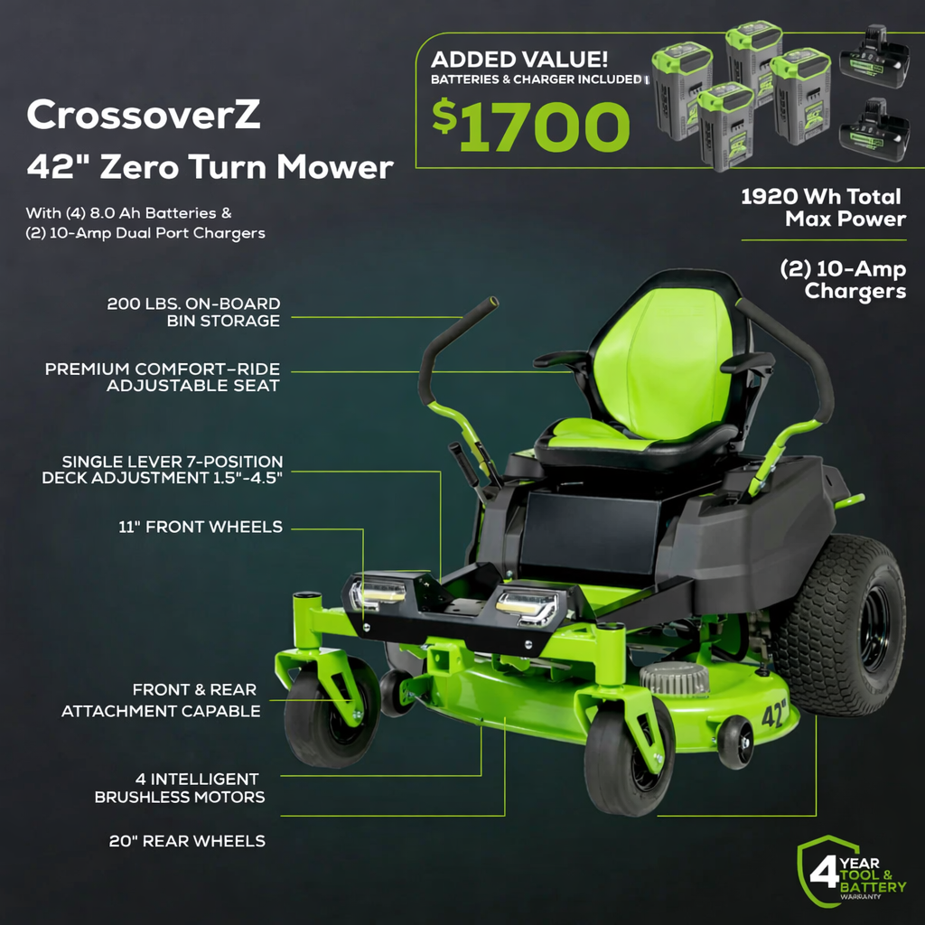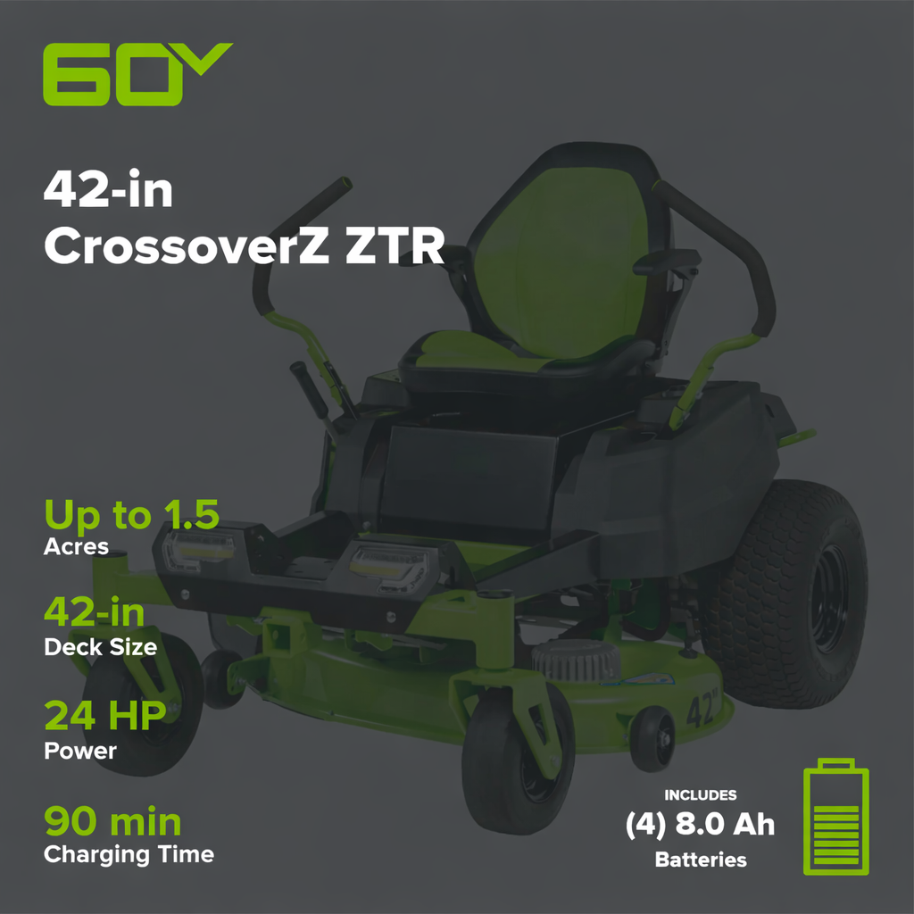 60V 42″ Electric CrossoverZ Zero Turn Mower w/ (4) 8.0Ah Batteries & (2) Dual-Port Turbo Chargers