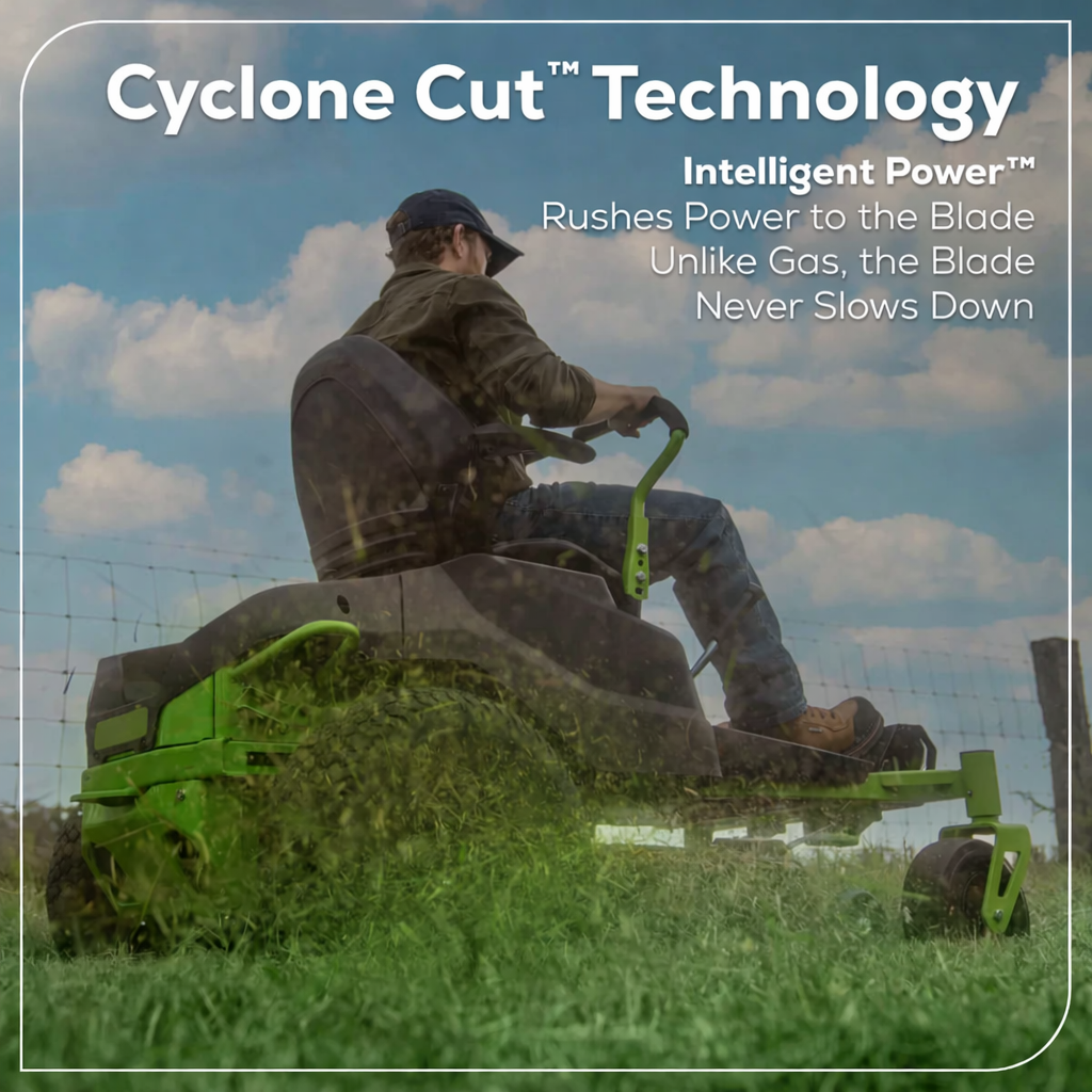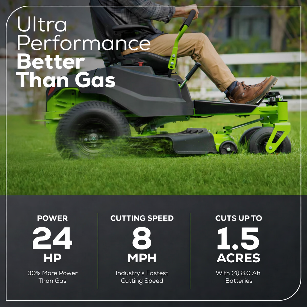 Power meets precision. Built for serious performance, this zero-turn mower delivers gas-like strength with electric efficiency. With a 24HP equivalent brushless motor, it cuts up to 1.75 acres on a single charge while staying quiet, clean, and maintenance-free.