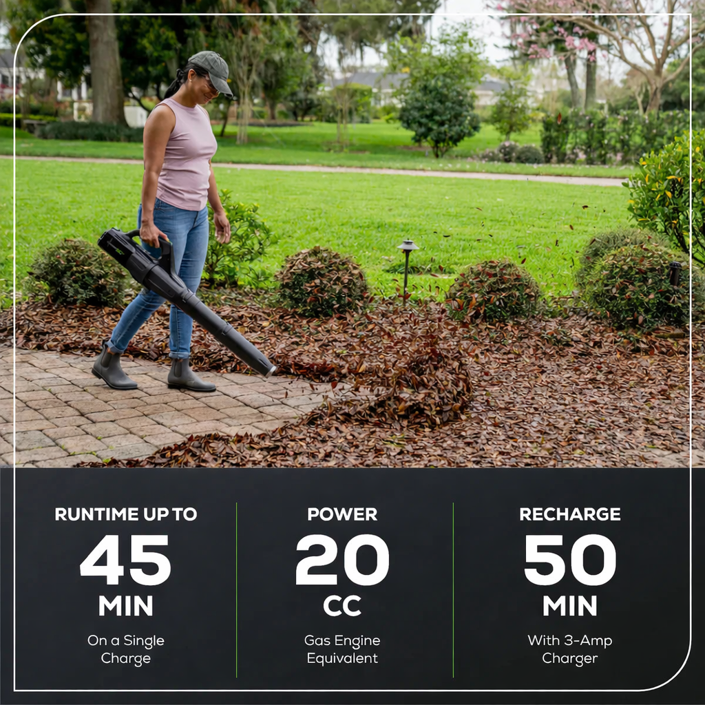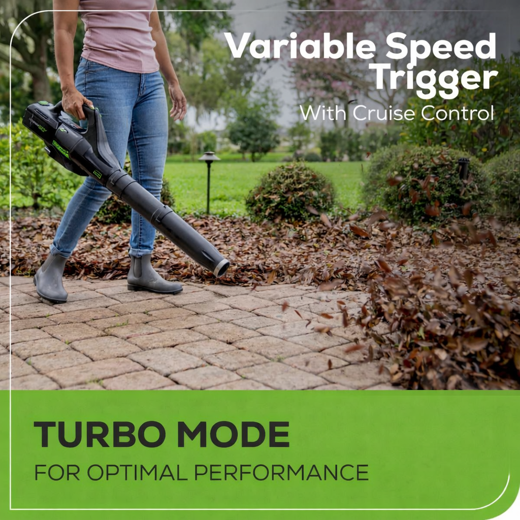 Greenworks cordless leaf blowers are here to take the work out of yard work. Powered by advanced 60V lithium-ion technology, this high-performance blower delivers gas-equivalent power without the noise, fumes, or maintenance. With up to 450 CFM air volume and 140 MPH air speed, it easily clears leaves, debris, and even stubborn wet materials.