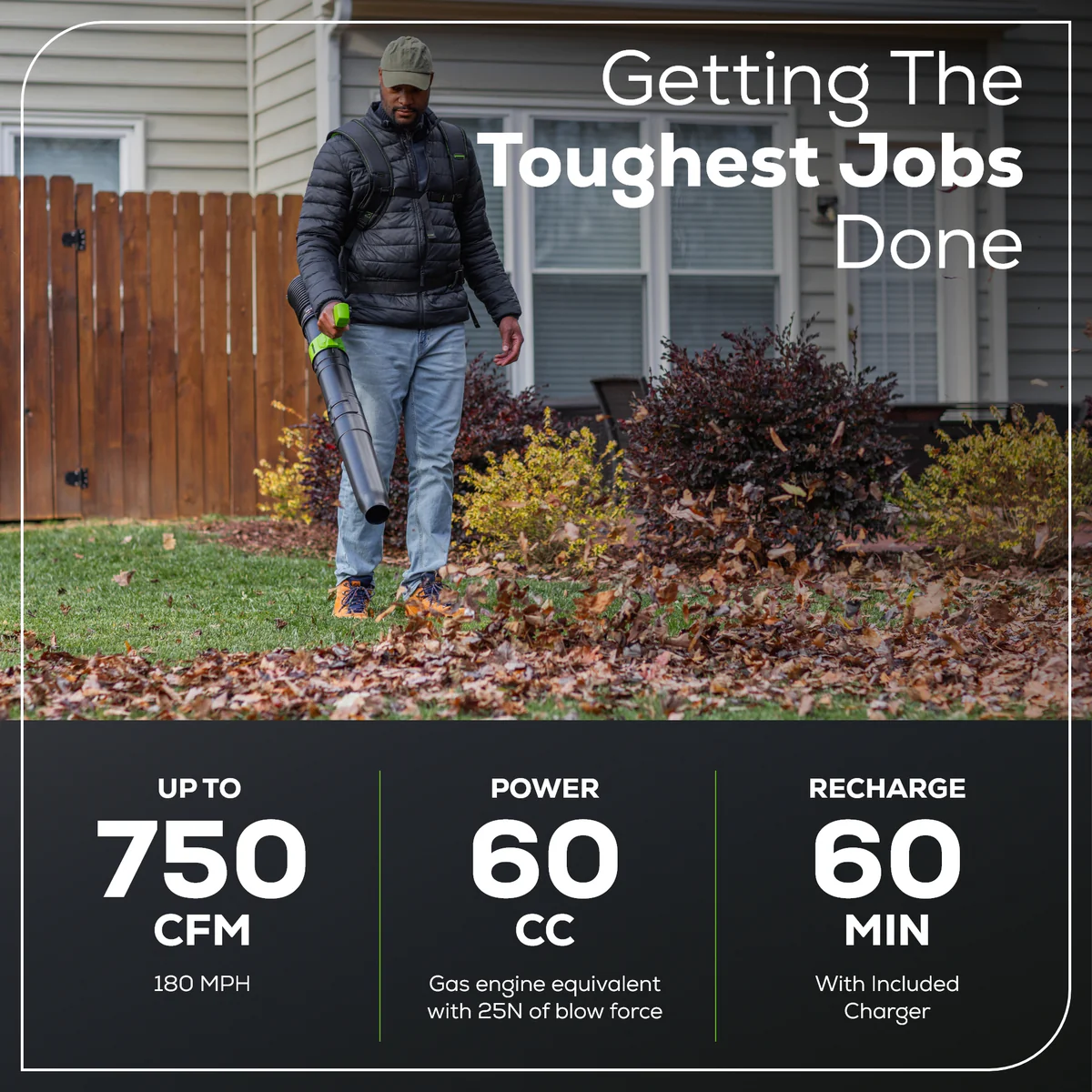 - High-Power Performance – Up to 750 CFM / 180 MPH for tackling both dry and wet leaves with ease