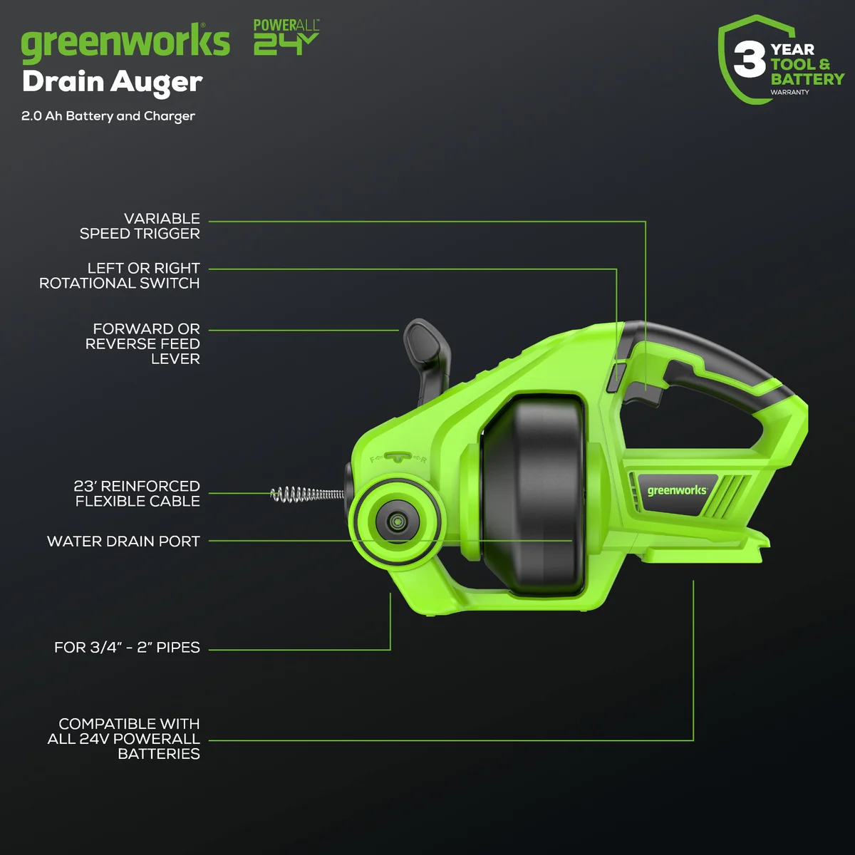 Take control of tough clogs with the PowerFlow 24V Cordless Drain Auger, built for power, precision, and convenience. Designed to handle stubborn blockages in hard-to-reach pipes, this tool delivers professional-grade performance without the hassle of cords—making it ideal for both home users and DIY professionals.