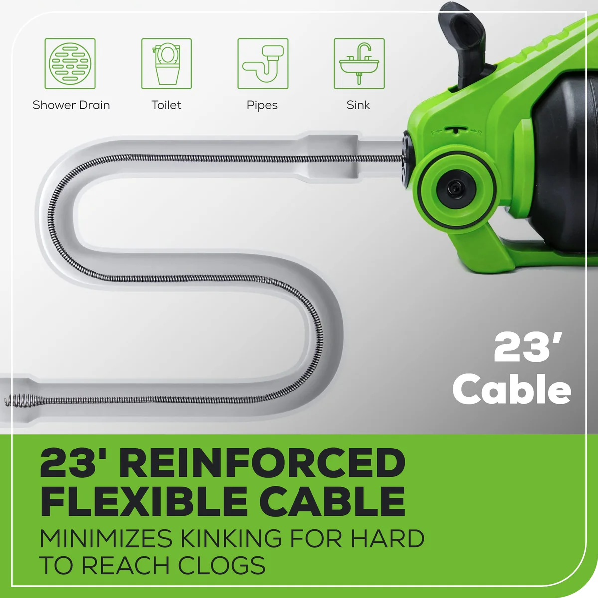 - Extended Reach Cable – 23 ft. reinforced cable designed to tackle deep and hard-to-reach blockages